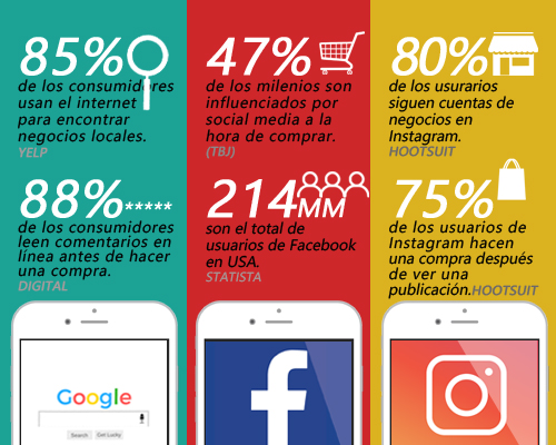 Actualmente, es casi obligatorio para pequeños-medianos negocios estar en línea. Nosotros ayudamos a los negocios a estar en las plataformas mas populares del internet como; Google, Facebook, Instagram y YouTube. Hay mas competidores que nunca y estar donde sus potenciales consumidores pueden encontrarle, es el tiempo de colocarse delante de ellos. Los consumidores buscan productos y servicios en línea mas que en cualquier otro lugar. Ellos leen y creen en los comentarios que otros consumidores colocan en línea sobre otros negocios locales, de la misma forma en la que ellos creen en las recomendaciones de amigos y familiares.